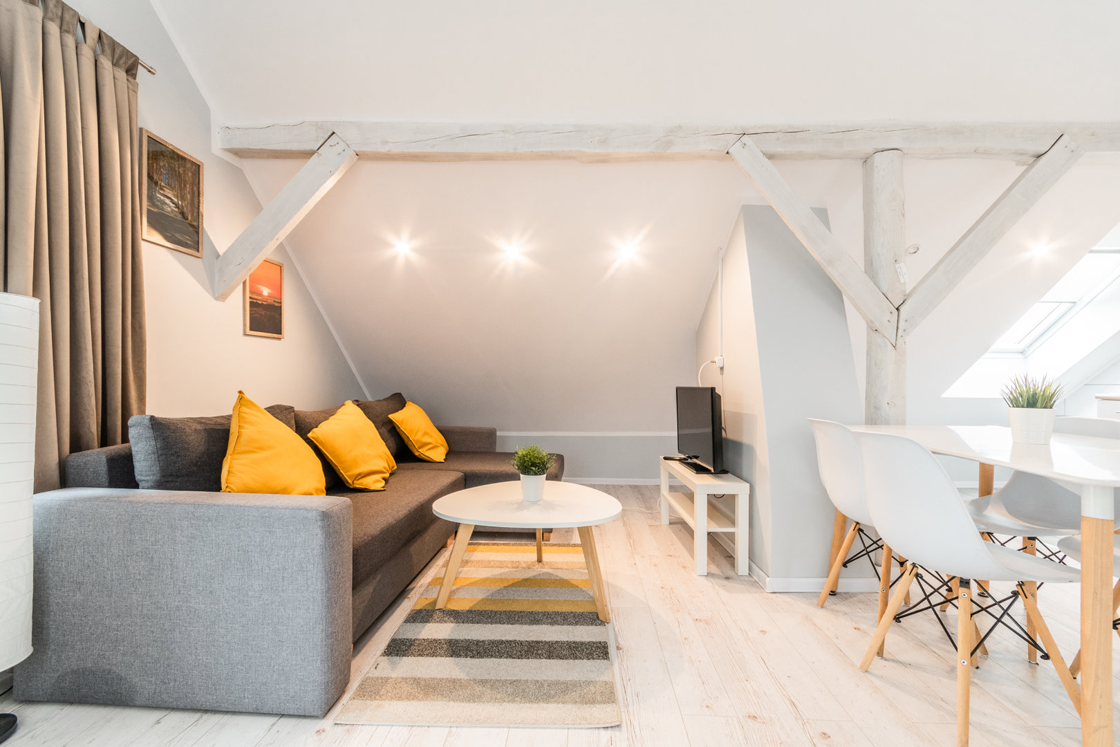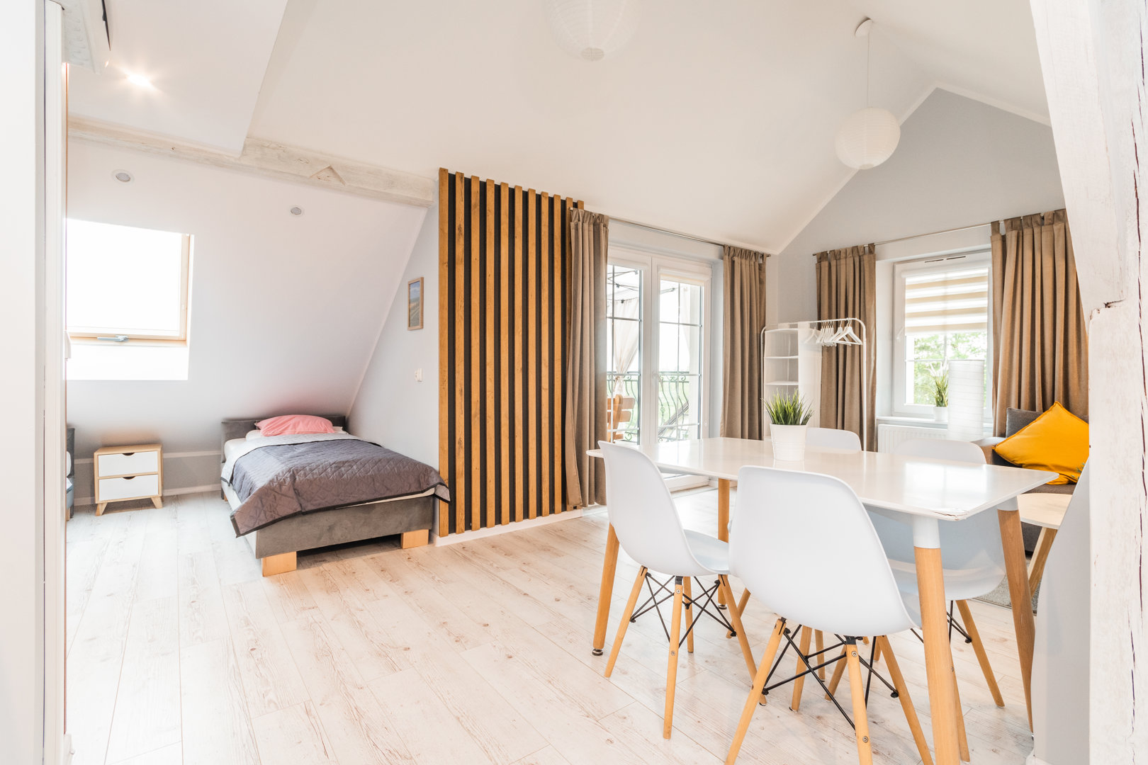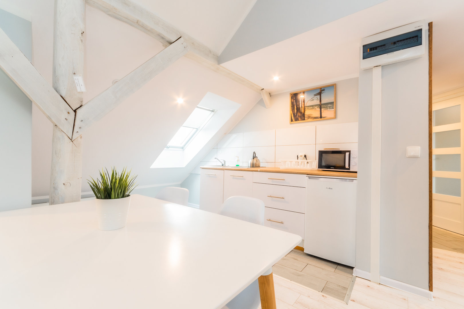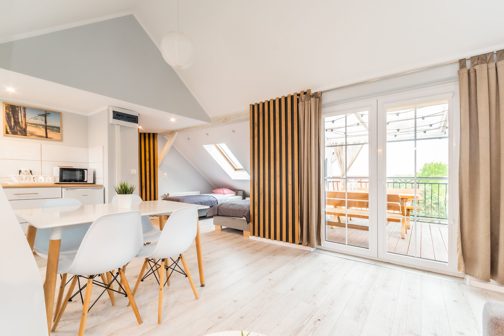 Apartament nr 3 ma powierzchnię 50 m2 + taras 10 m2. Znajduję się on na drugim piętrze budynku, został zaadoptowany z niegdysiejszego poddasza, przez co jest jest on najbardziej „klimatyczny” ze wszystkich naszych apartamentów. Pozostawienie na wierzchu starych belek konstrukcyjnych oraz zaaranżowanie tarasu „wciętego” w dach dodatkowo dodaje uroku i przytulności.