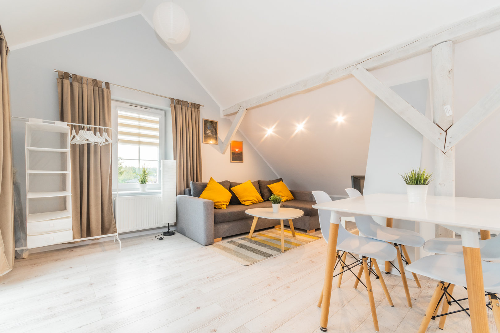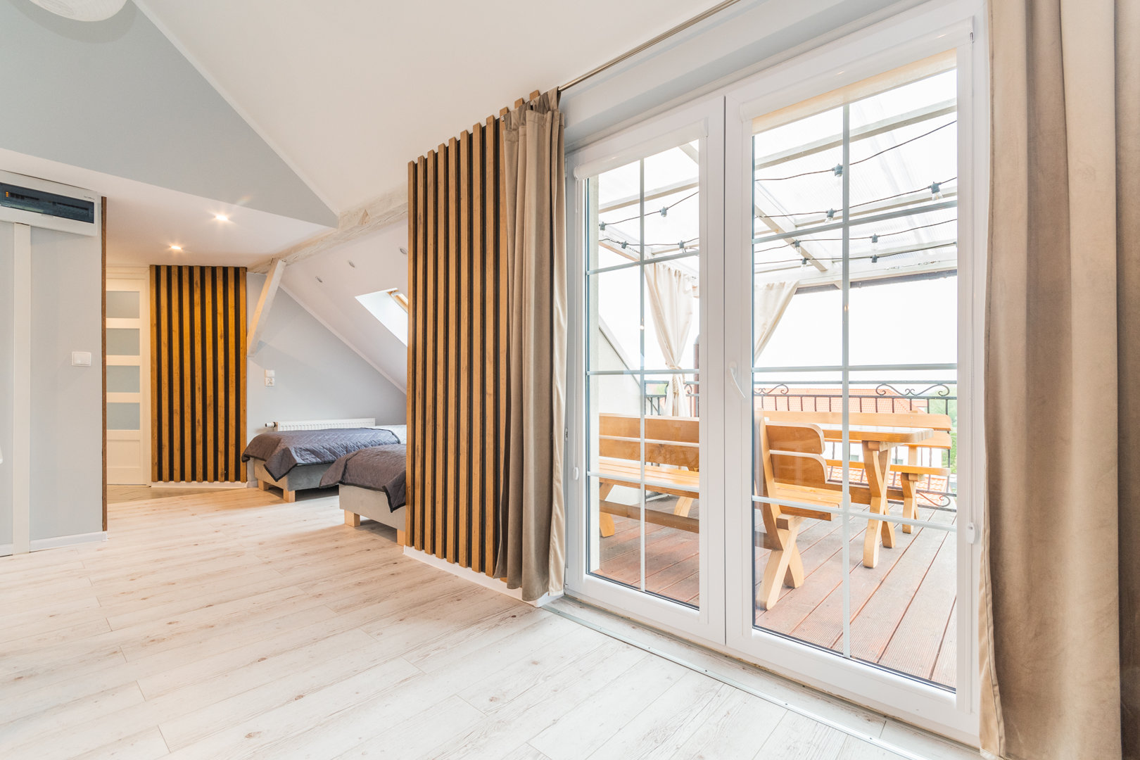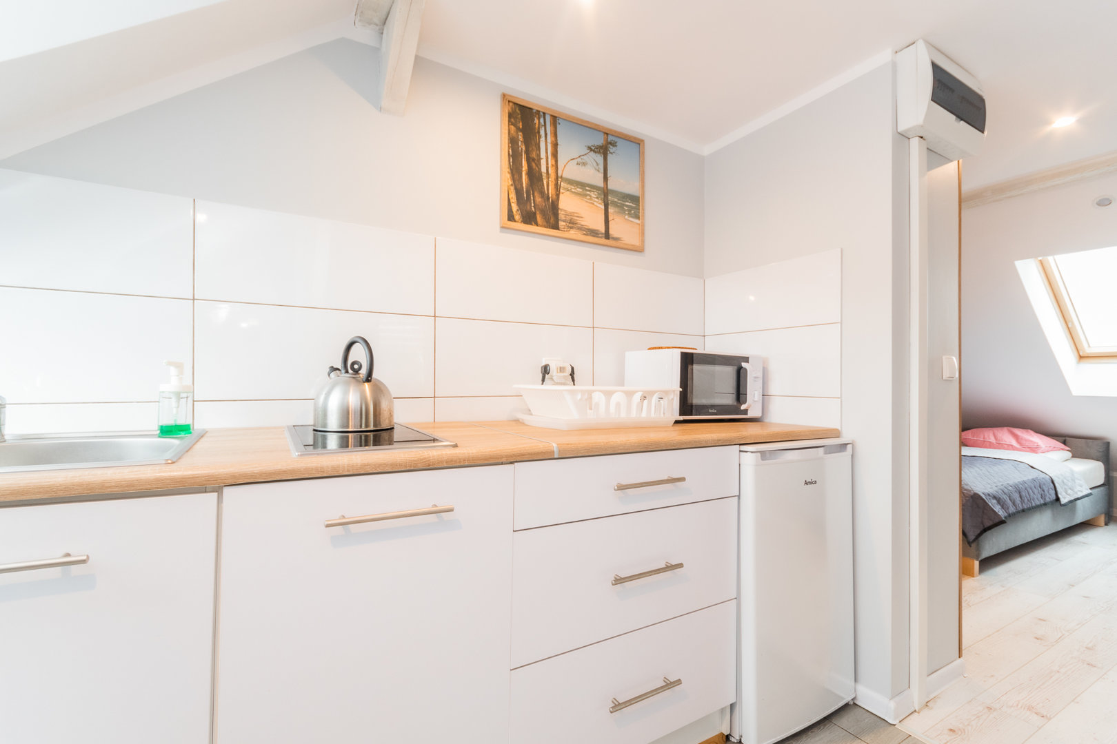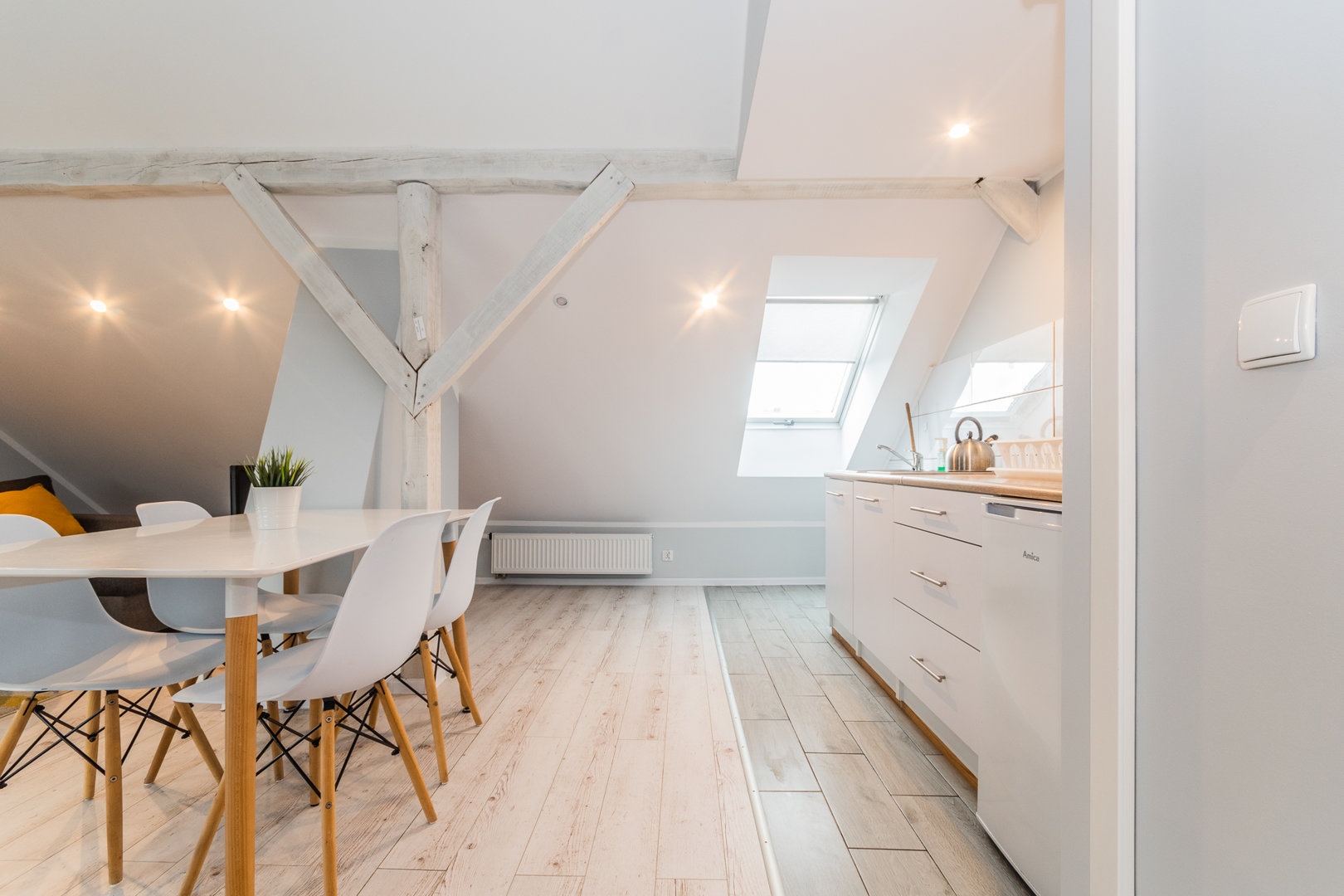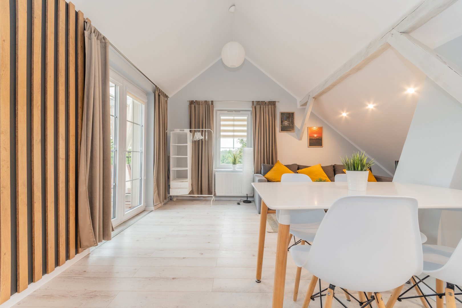 Apartament nr 3 ma powierzchnię 50 m2 + taras 10 m2. Znajduję się on na drugim piętrze budynku, został zaadoptowany z niegdysiejszego poddasza, przez co jest jest on najbardziej „klimatyczny” ze wszystkich naszych apartamentów. Pozostawienie na wierzchu starych belek konstrukcyjnych oraz zaaranżowanie tarasu „wciętego” w dach dodatkowo dodaje uroku i przytulności.