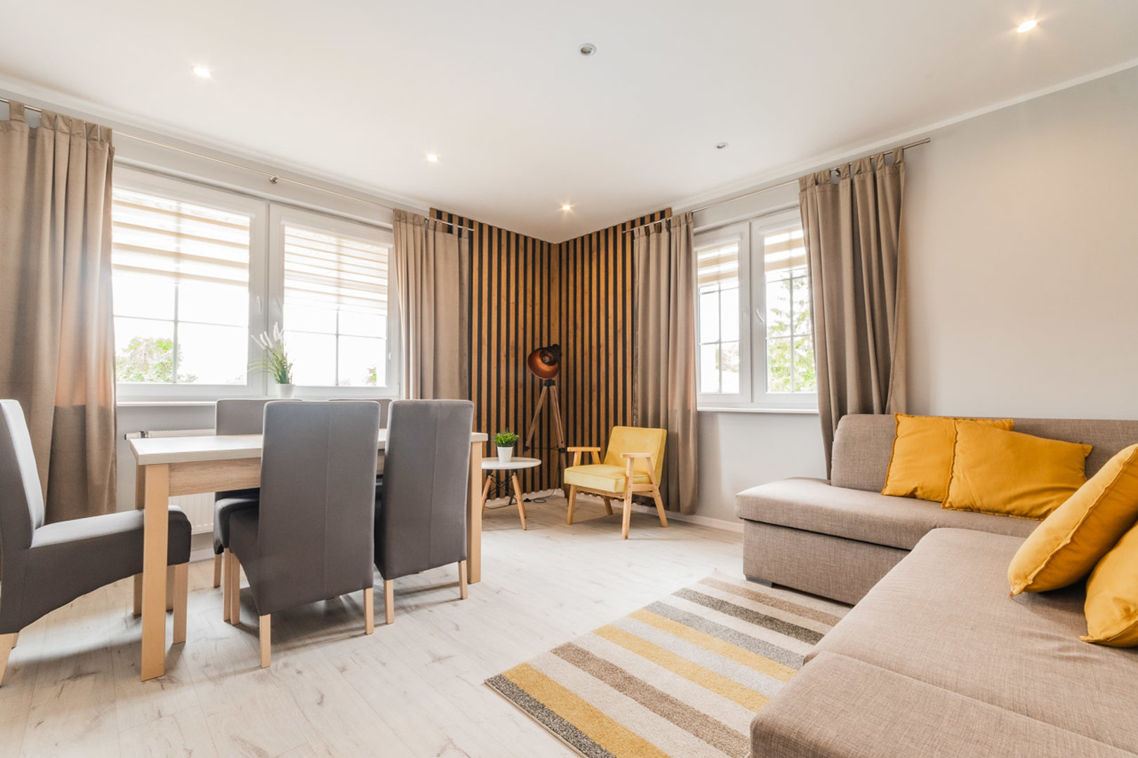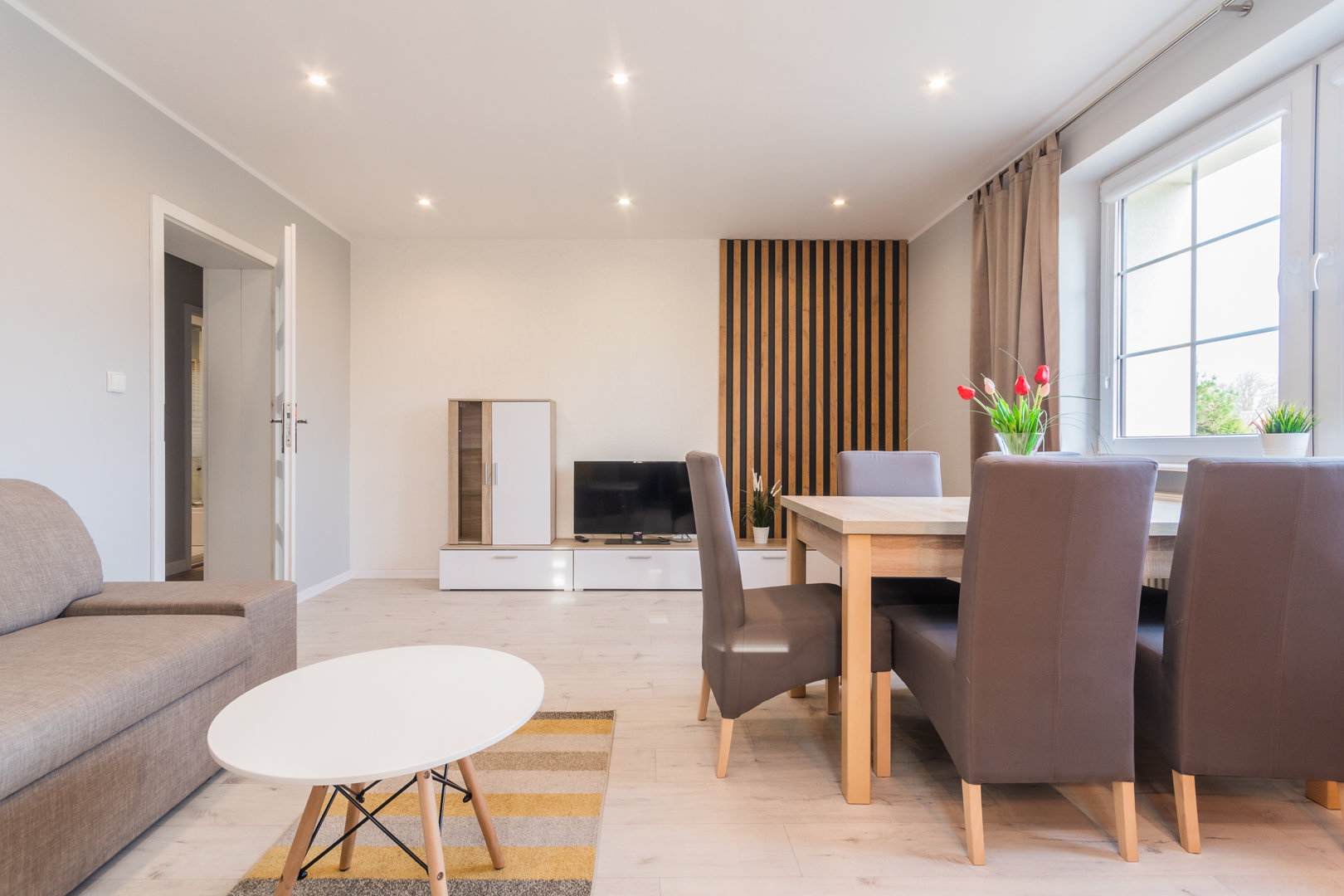 -pokój dzienny z TV, rozkładany narożnik, stół z krzesłami.