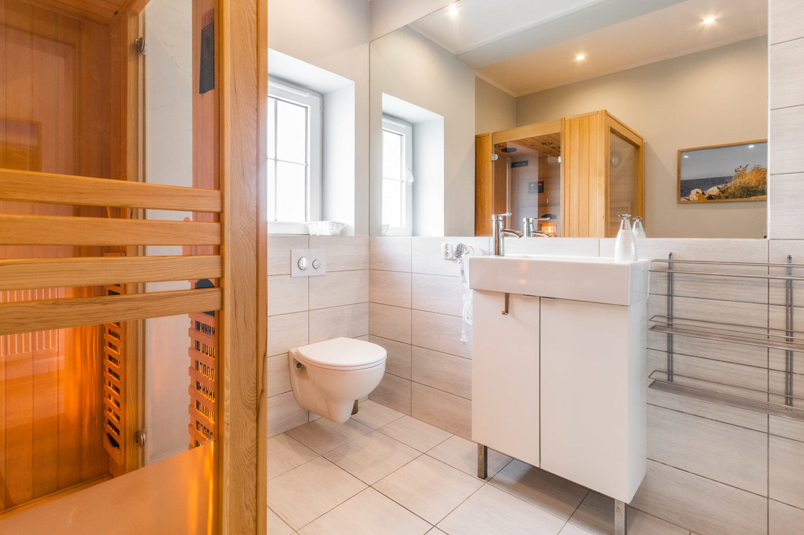 Apartament numer 1 z sauną ma powierzchnie 80 m². Znajduje się w budynku stojącym przy basenie. Stanowi cały parter tego budynku. Posiada niezależne wejście bezpośrednio z zewnątrz.