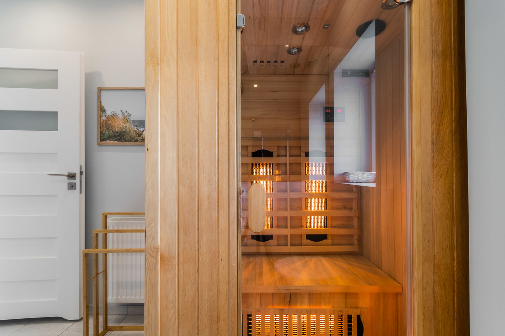 Jego mocną stronę stanowi duży taras na którym można zarówno spożywać posiłki, opalać się jak i wieczorami zażywać chwil relaksu na powietrzu. apartament jest wyposażony w saunę infrared.